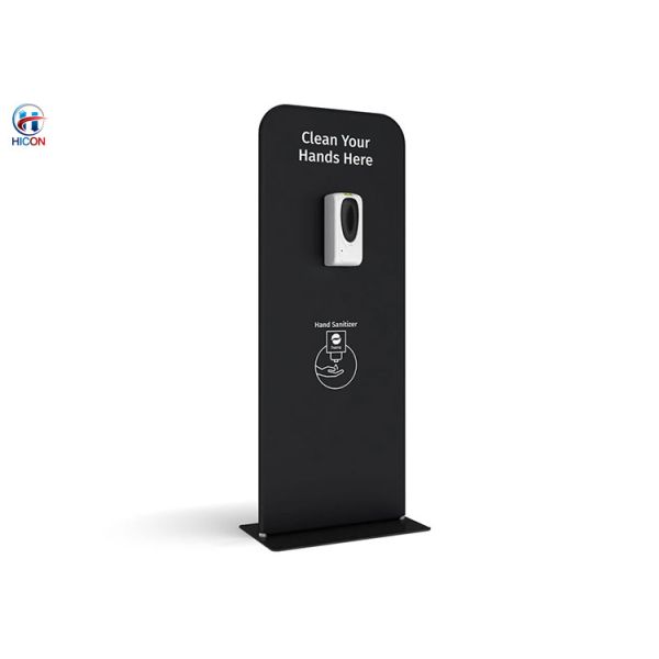 This black automatic hand sanitizer dispenser stand is great for use in public settings, like airport terminals or medical reception areas. Secure your soap dispenser using 2-sided tape. Manual dispensers not recommended.